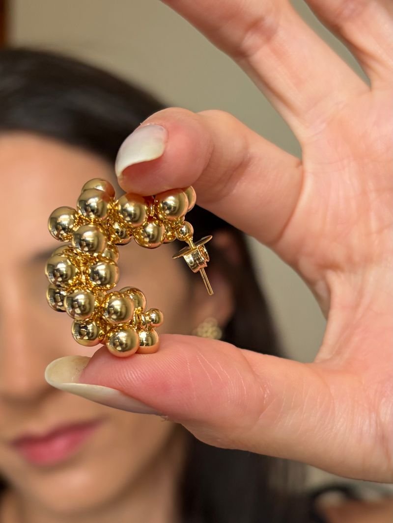 Argola em formato de esferas, tamanho médio e extremamente leve. Feita pensando em mulheres que gostam de usar brincos com presença, mas sem se sentirem desconfortáveis com um peso na orelha ao longo do dia.