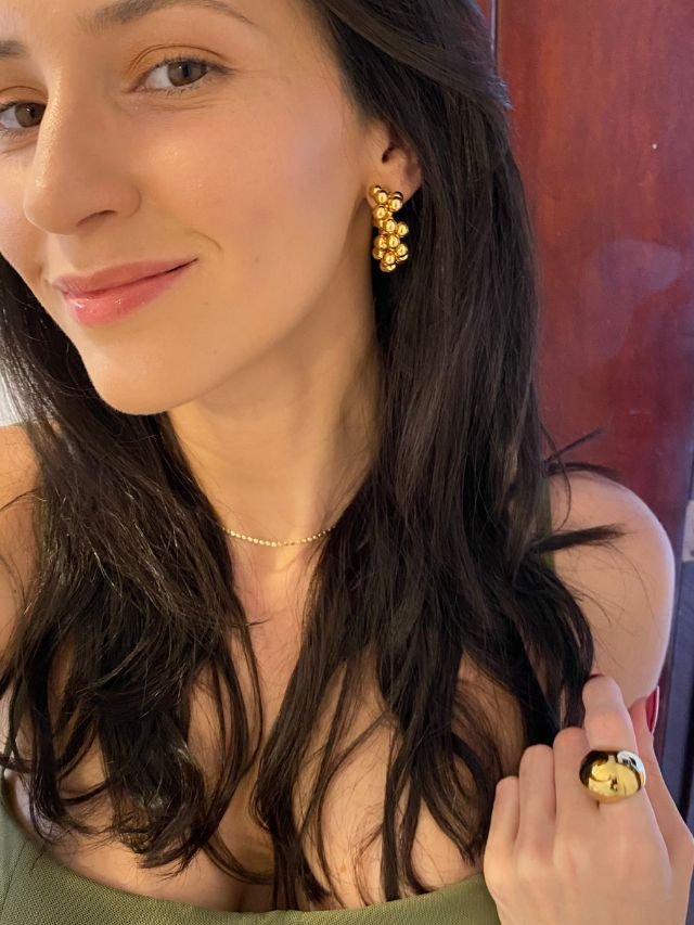 Argola em formato de esferas, tamanho maxi porém extremamente leve. Feita pensando em mulheres que gostam de usar brincos com presença, mas sem se sentirem desconfortáveis com um peso na orelha ao longo do dia.
