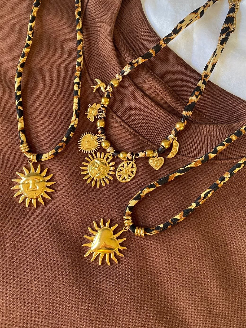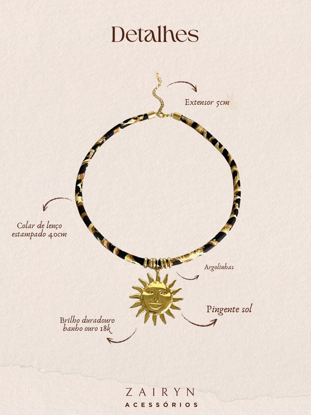 O Zion nasceu para quem ama seguir tendências, mas sem abrir mão do conforto e da delicadeza. Ele mistura o toque macio do lenço com estampa animal print com pingente em formato de sol, que dá movimento e personalidade ao look. Ele também pode ser usado como uma choker, pelo tamanho do pingente, traz muita presença na composição do look.