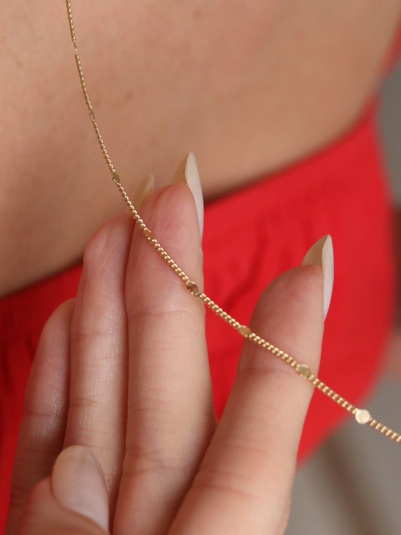 A corrente é banhada em ouro 18k, com uma camada de 07 milésimos e verniz – níquel free e hipoalergênico.
