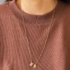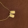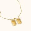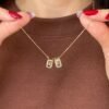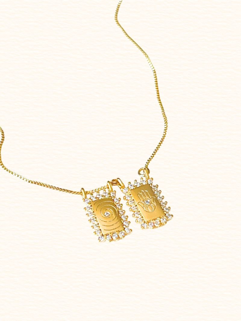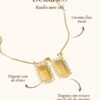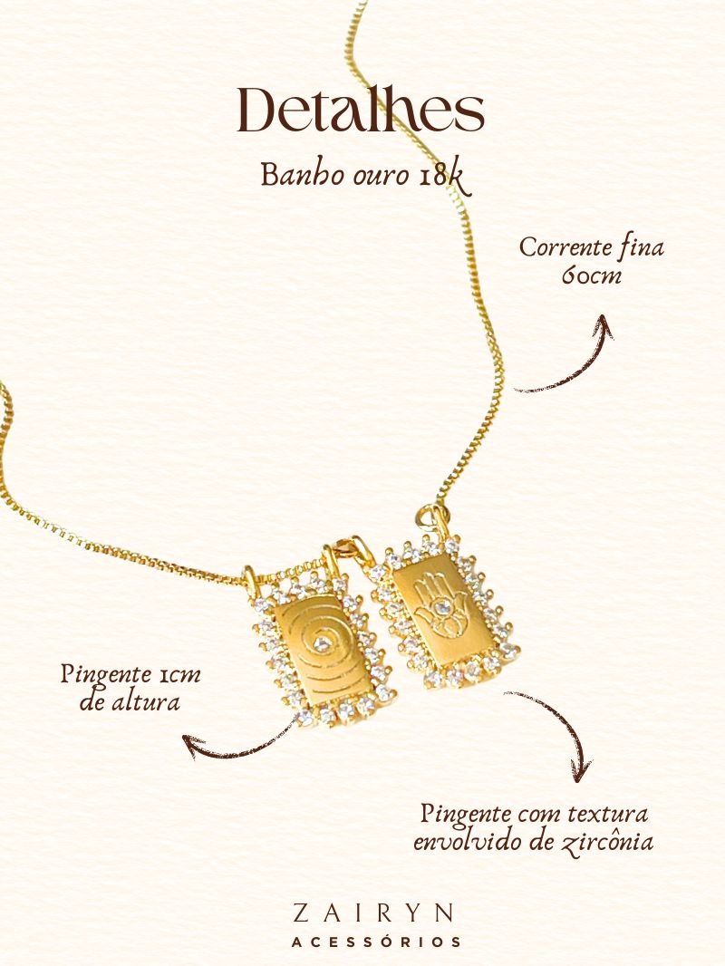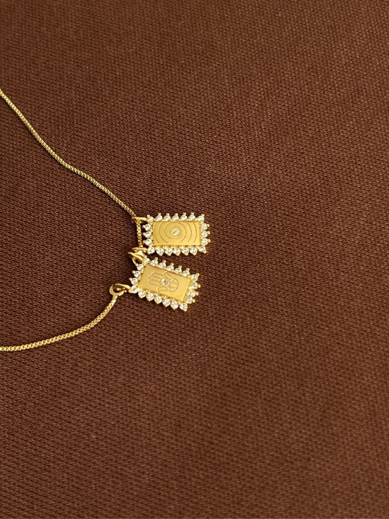 Escapulário com corrente fina, dois pingentes com design moderno e textura, envolvido de pedras de zircônia.